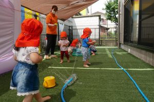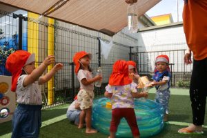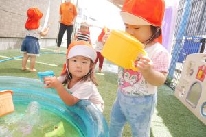 水遊びでは、ペットボトル噴水に近づいたり、プールに浮かんでいるおもちゃで、水を汲んだ