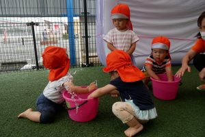 お顔に水が飛んできてもへっちゃらで、「きゃはは」とお友だちと顔を合わせて笑い合っていました?