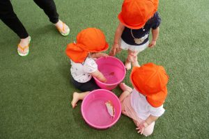 保育士が葉っぱを水に浮かべると、いちご組さんも葉っぱを探しにいき、上手に浮かべることが出来ましたよ?