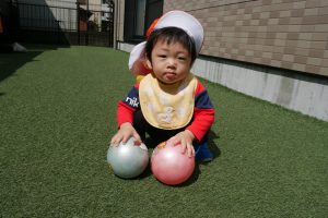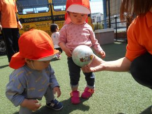 園庭では、端から端まで走ったり、 ボールを一生懸命追いかけたりして、体を動かしました?
