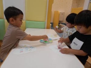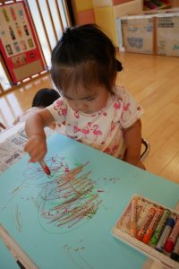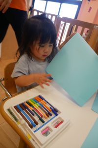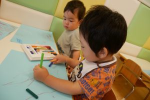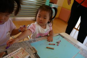 お絵描きでは、クレヨンを使うのが上手になってきて、いろんな色を使ってみようとする姿が見られました✨「赤」「青」と色の名前を言っている子もいましたよ?