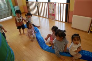 落ちそうになりながらも、保育士と手を繋いで渡ったり、座って渡ってみたりして楽しそうでした?