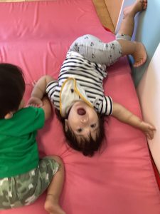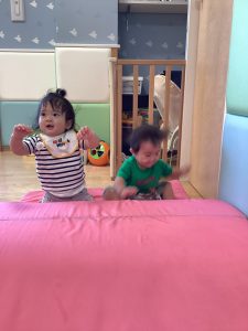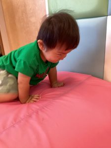 マットの坂をハイハイで登り降りして身体を動かして遊ぶもも組のお友だち👶🏻