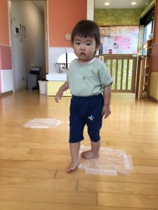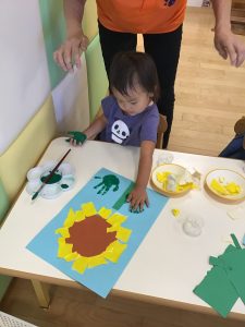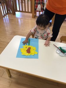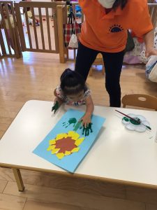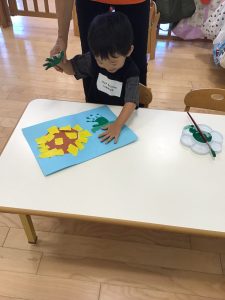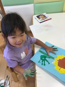 最後は緑色の絵の具で手形を押して葉っぱにしました。久しぶりの手形押し。みんなの手が大きくなっていて驚かされました。