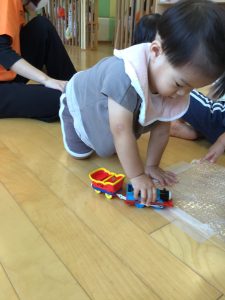 電車遊びでは床の線に合わせて「ブーン!」「シュッシュー!」と走らせています🚃