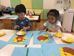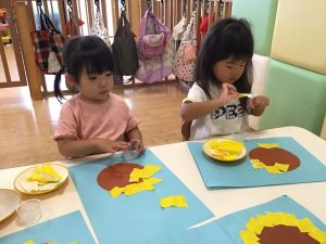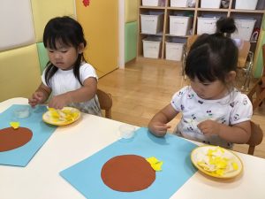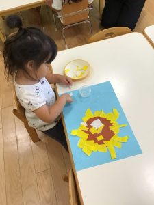 大きいまま貼る子、小さく小さく千切ってから貼る子、丁寧にゆっくり貼る子等個性が出ていましたよ。