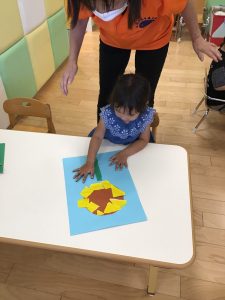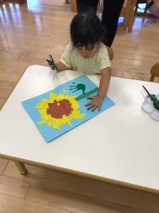ひまわりの絵本を見て「みんなで作ってみる?」と聞くと「つくるー」とやる気満々のりんご組さん。