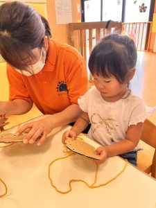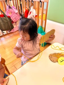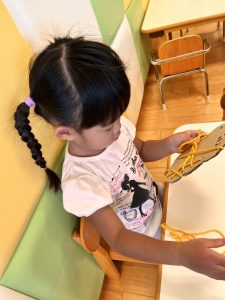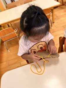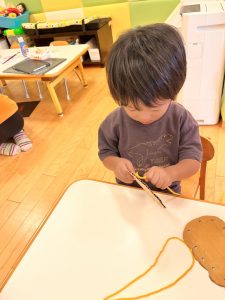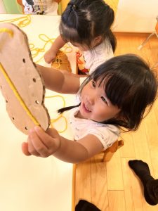 みんな丁寧に穴に通したら引っ張って、もつれないようにして上手でした。