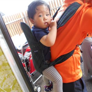 いちご組のお友達はバギーに乗ったり、保育士と手をつないで歩いたりしてお散歩しています。