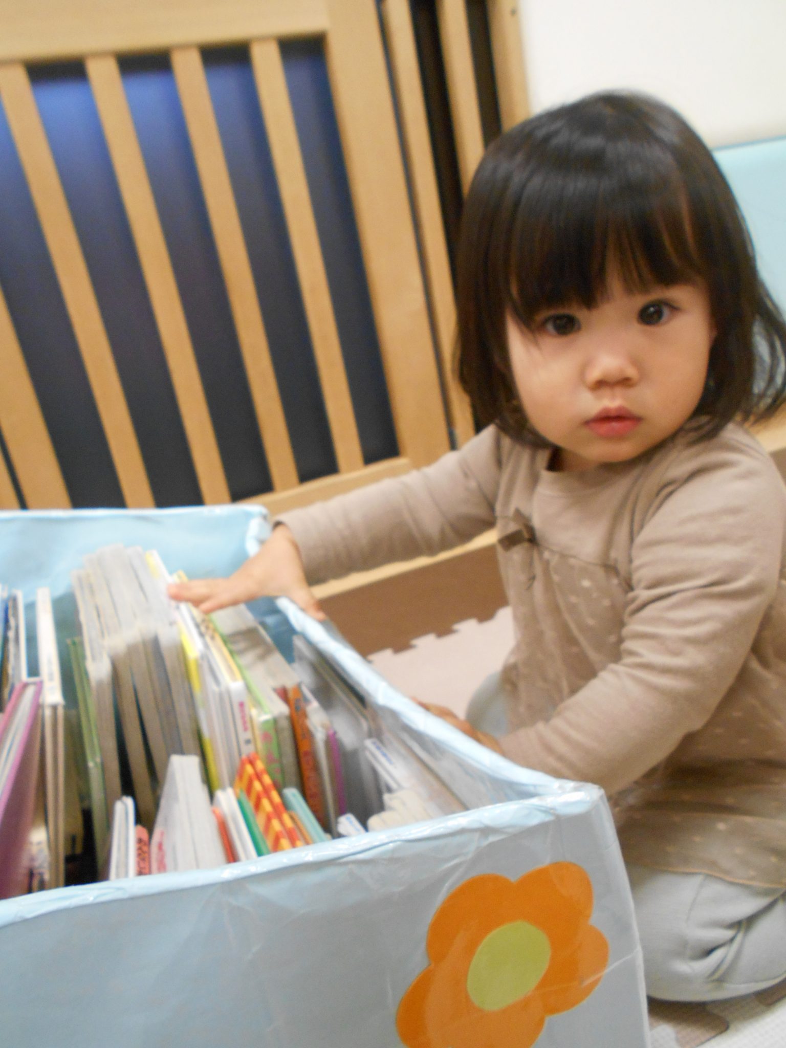 絵本の箱から自分の好きな絵本を選んで自由に絵本を楽しんでいます☺