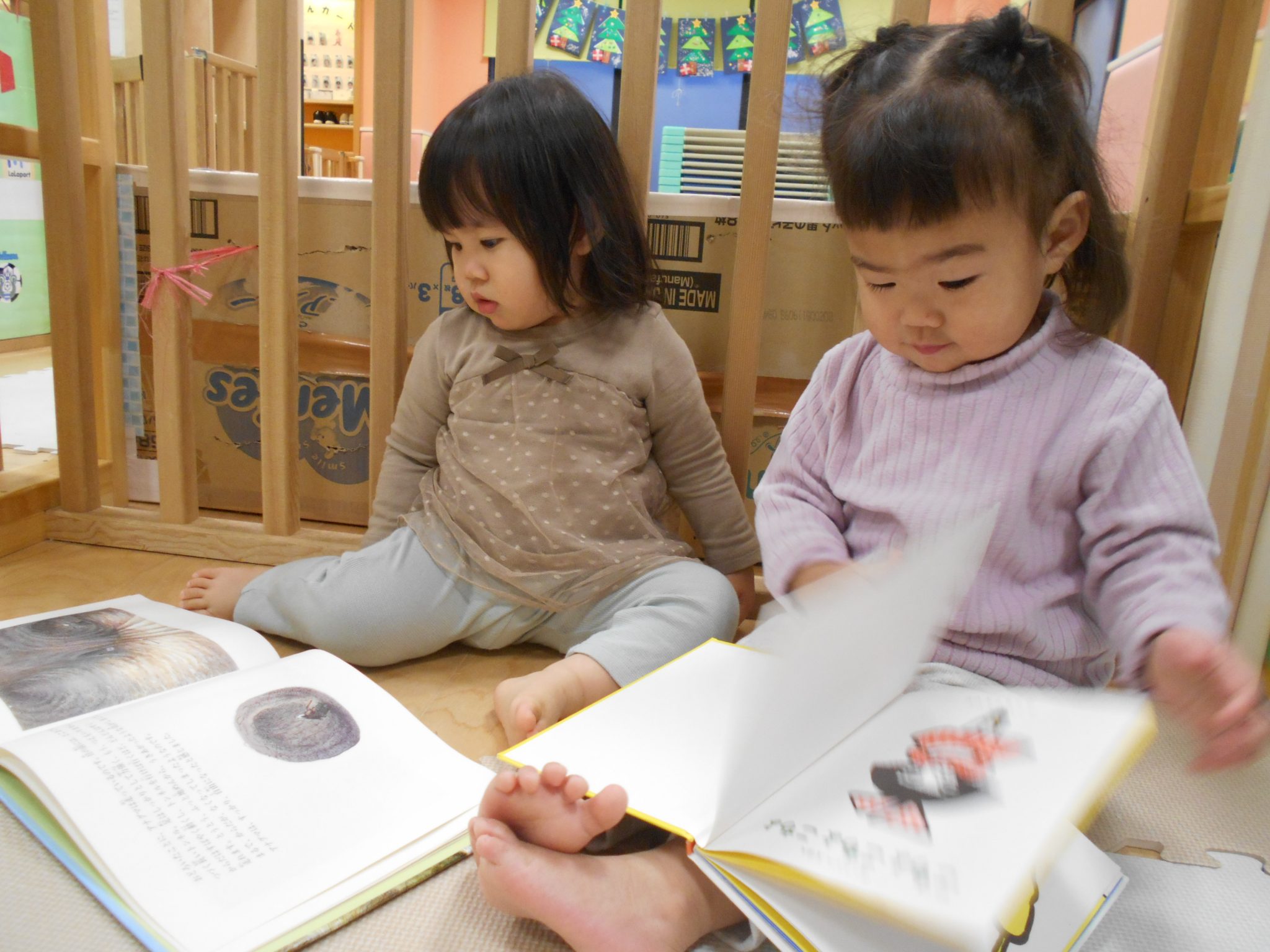 お友だちと並んで一緒に読んだり、