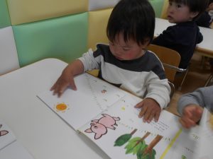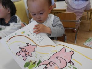 ぶたの絵を見ると「ぶー!」とゆびを指して興味津々な子ども達!