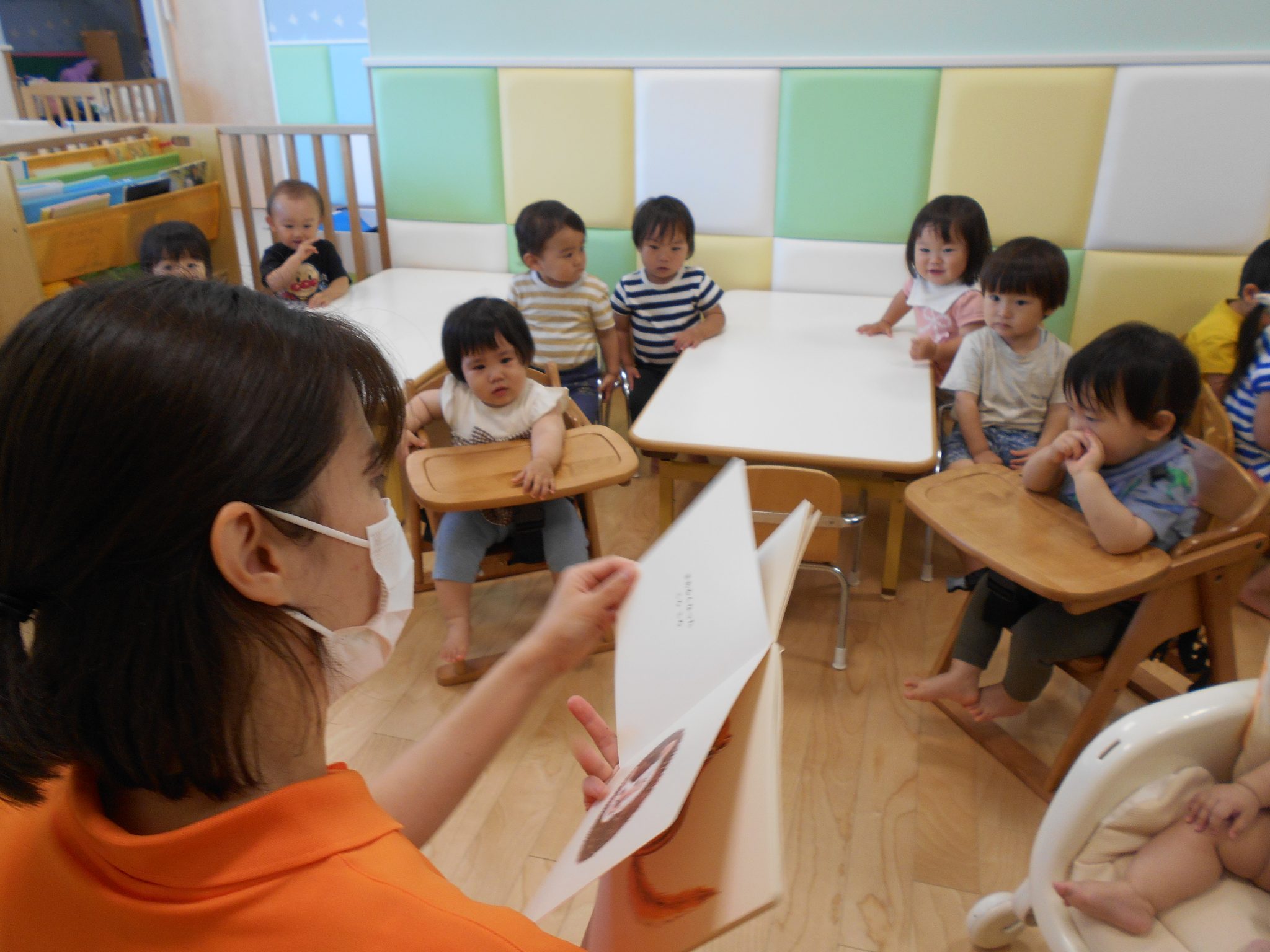 保育園では、子ども達みんなが絵本を楽しめるように子ども達の体の向きや、読み聞かせる保育士の位置など