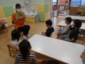 保育園では椅子に座ったり、床に座ったりしながら保育士と対面して絵本を楽しみます。