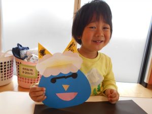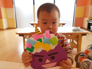 「オニ」の製作では、自分たちでビリビリに破いた折り紙を台紙にぺたぺた貼り、とってもかわいいオニたちが完成しました![]()