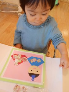 自分たちで千代紙をちぎって、のりでペタペタして貼り、ペンで自分で好きなように着物をかざりつけました!