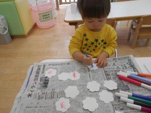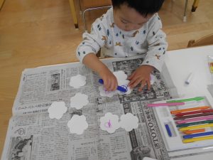 最後は保育士が糊をつけたお花を、自分たちで画用紙にぺたぺたと貼って完成しました![]()