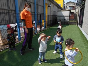 遊び始めると笑顔が弾け、元気いっぱいになりました。新入園児さんが泣いていると