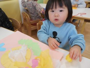 フラワーペーパーを丸めたりちぎったりしてタンポポを作りました。