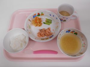 おかゆ・味噌汁・鮭の塩焼き・スティックきゅうり・含め煮