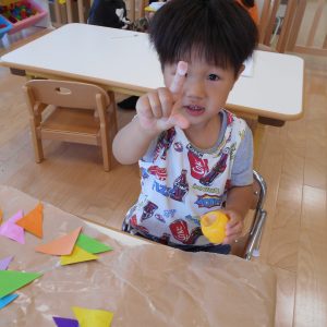 りんご組は、のりを使った折り紙つなぎや、クレヨンでの色塗りをしました![]()