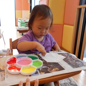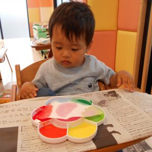 足の裏に絵の具をぺたぺた塗るのは、みんなドキドキ