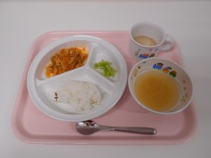 ご飯・味噌汁・ポークビーンズ・スティックきゅうり・みかん缶