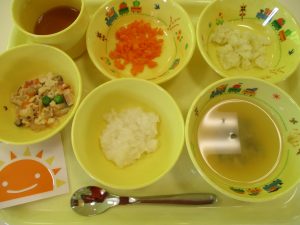 粥 味噌汁 炒り豆腐 ゆでにんじん ゆでポテト