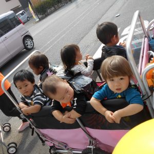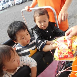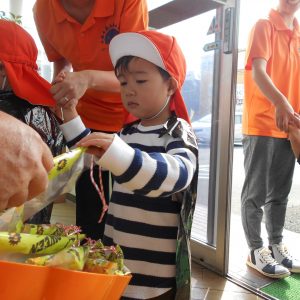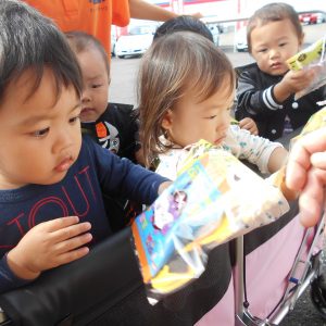 0歳児クラスは人見知りの子が多いのですが、しっかりとお菓子をお店の方から受け取って帰ってきました![]()