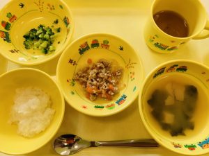 粥 味噌汁 鶏と野菜の煮物 ブロッコリーのしお茹で