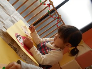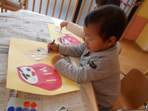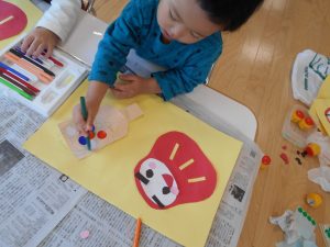今週は、製作活動で画用紙にだるまさんと羽子板を貼り、シールやクーピーで可愛く飾り付けをしました![]()