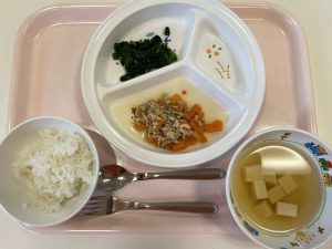 (写真は普通食になります。年齢によって盛り付け量を変えて、提供しています。)