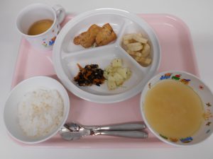 ご飯 味噌汁 魚の竜田揚げ ひじきの炒り煮 粉ふき芋 バナナ
