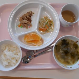 ご飯 味噌汁 しょうが焼き もやしのナムル オレンジ