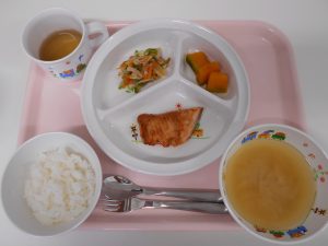 ご飯 味噌汁 鮭の香りみそ焼き 野菜炒め かぼちゃ甘辛煮