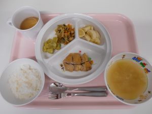 ご飯 味噌汁 鶏肉のママレード焼き スパゲッティサラダ オレンジ
