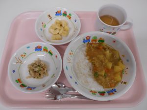 ご飯 カレーシチュー 切干大根のサラダ バナナ バナナ