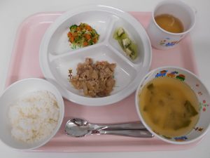 ご飯・味噌汁・豚肉の甘酢炒め・おかか和え・キウイ おかゆ・味噌汁・ツナの甘酢かけ・おかか和え &nb...