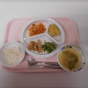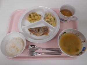ご飯・味噌汁・魚のからあげ・マカロニサラダ・含め煮