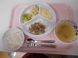 ご飯・味噌汁・鶏肉のみそ焼き・スパゲティーソテー・きゅうりのおかか和え・バナナ おかゆ・味噌汁・茹で...