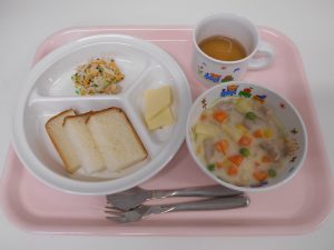 食パン・コーンクリームシチュー・味噌ドレッシングサラダ・チーズ 食パン・クリームシチュー・キャベツの...