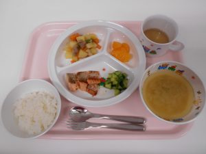 ご飯・味噌汁・鮭の塩焼き・きゅうりのポリポリ・ジャガイモと鶏肉の煮物・みかん缶 おかゆ・味噌汁・鮭の...