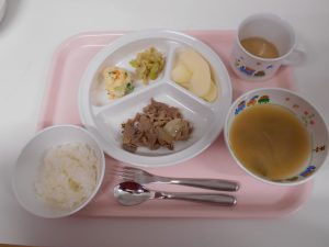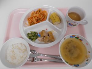・ご飯 ・味噌汁 ・鶏肉のみそ焼き ・スパゲッティーソテー ・きゅうりのゆかり和え ・バナナ