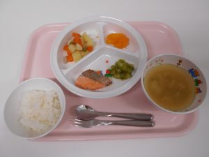 ・ご飯 ・味噌汁 ・鮭の塩焼き ・きゅうりのポリポリ ・ジャガイモと鶏肉の煮物 ・みかん