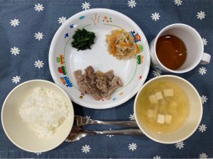 ごはん 味噌汁 豚焼肉 切干大根の煮物 ほうれん草のごま和え