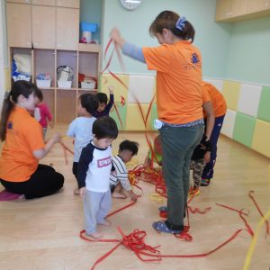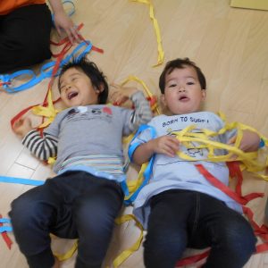 途中長すぎて引っかからないように先生たちがさりげなく短めに切っている中、みんなはたくさんの紙テープの中歩いたり、くしゃくしゃにして集めて投げたりして大喜び![]()