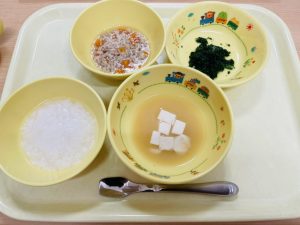※離乳食を食べている子どもたちは、椅子にすわると「マンマ、マンマ」と言って、ご飯を食べたがっている様子が見られ嬉しく思いました♪今日もみんなたくさん食べました!!