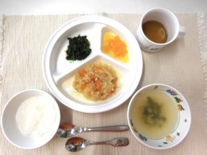 (写真は普通食になります。年齢によって盛り付け量を変えて、提供しています。)