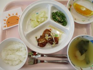 ご飯 味噌汁 豚肉の南蛮漬け 粉ふき芋 無限ピーマン オレンジ