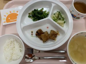 粥 味噌汁 煮魚 小松菜のおかか和え じゃが芋煮